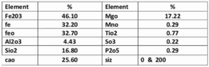 Cao 91-92% Fe2O3 0.4 Al2O3 0.2 Sio2 0.25 Mgo 2.36 S 0.11 Co2 2.64 Moisture 0.08% Size powder <2 mm. 73.5% , 2-6 mm. 26.5% |